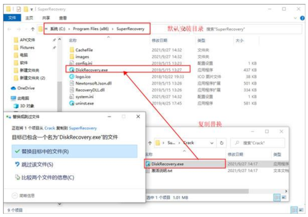 4、把Crack文件夾中的DiskRecovery.exe文件替換到安裝目錄中;默認安裝目錄【C:\Program Files (x86)\SuperRecovery\】