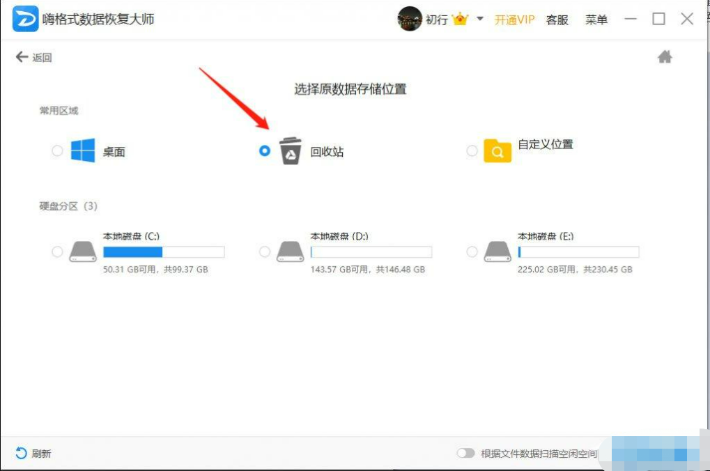 3、選擇原數據存儲位置區域,在這里我們以回收站為例,勾選后再點擊右下角的“開始掃描”。