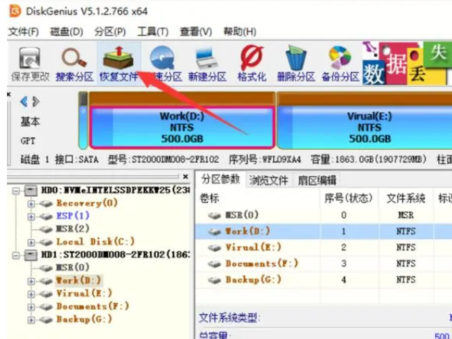 1、運行DiskGenius軟件,選擇需要恢復文件的分區,點擊“恢復文件”按鈕。