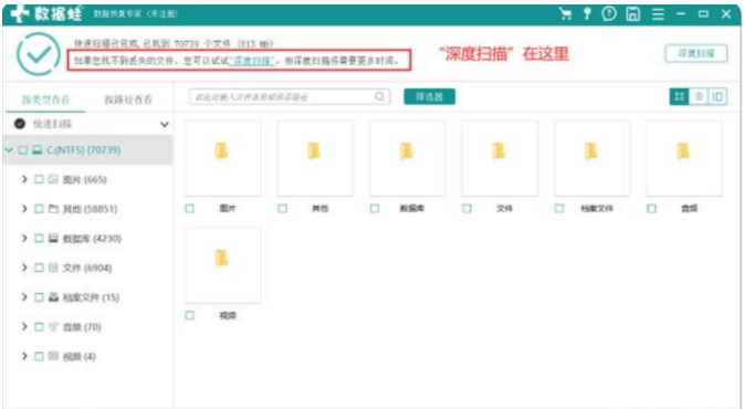 2、大家可能會發現,第一次掃描后并沒有找到全部的丟失數據,那是因為第一次掃描追求速度,相當于殺毒軟件的快速掃描,所以這種情況我們點擊“深度掃描”即可,對應殺毒軟件的全盤掃描,等待時間稍久,但掃描質量提升數倍!