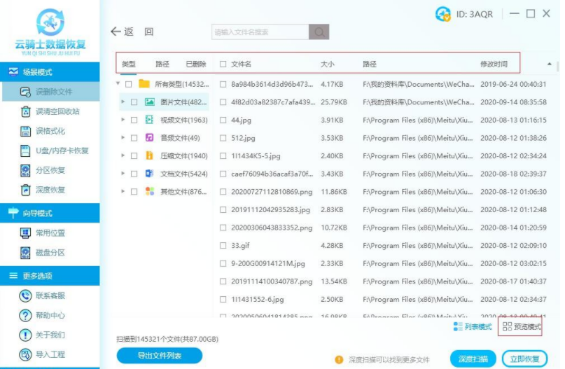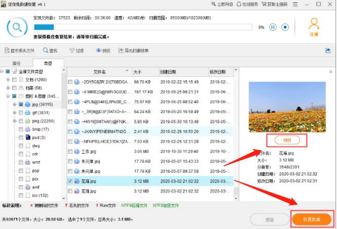 步驟三:掃描完成在界面右側顯示掃描出來的文件,手動篩選找到所需的照片并雙擊或者點擊預覽模式進行預覽,