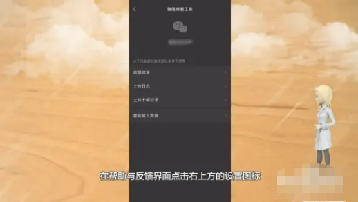 2、點擊幫助與反饋選項,在幫助與反饋界面點擊右上方的設置圖標,進入微信修復工具。