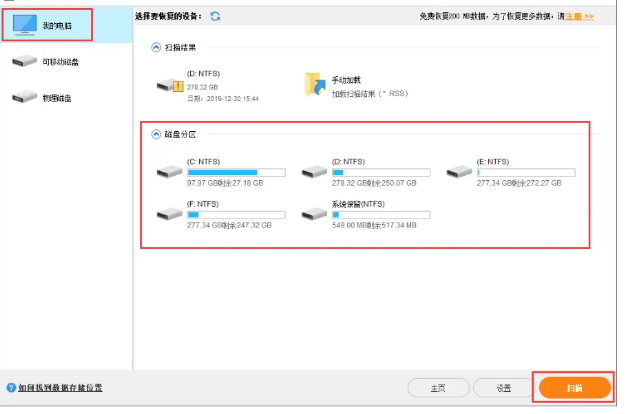 2、選擇系統分區,點擊掃描。