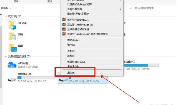 步驟2:找到U盤圖標,右鍵點擊U盤,在彈出選項中選擇“屬性”;