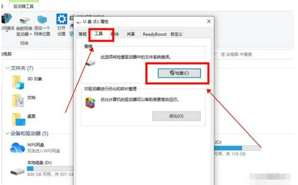 步驟3:在U盤屬性窗口中,點擊上面的“工具”,再選擇點擊“檢查”按鈕;