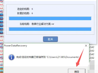 6、點擊確定,數據就開始進行恢復?;謴统晒螅瑢⒂幸粋€提示框告訴我們恢復的數據存儲在哪里。在該位置,就可找到恢復的數據了。