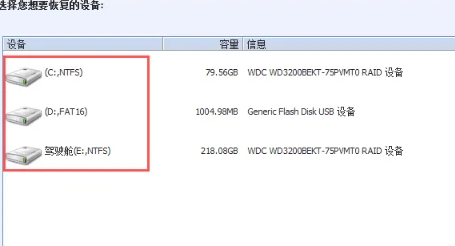 3、選擇要恢復的盤符,選擇該盤符,再點擊右側的“恢復”按鈕,進入“恢復”界面。