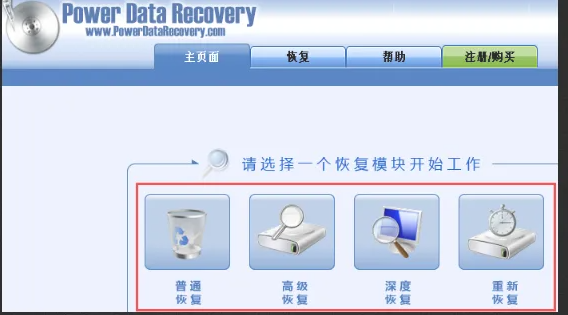 1、打開PowerDataRecovery軟件,進入其主界面。這里有四種恢復模式,普通恢復、高級恢復、深度恢復、重新恢復。