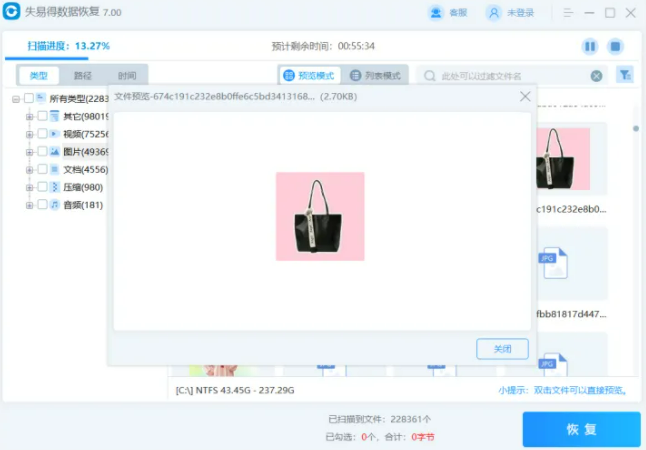第四步:掃描完畢之后,找到自己要恢復的文件,點擊預覽確認文件是否能夠正常預覽,能正常預覽就說明能正?;謴停覀児催x要恢復的文件,點擊恢復按鈕,選擇路徑保存即可恢復到電腦上。