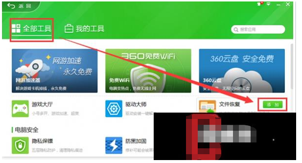 2、選擇所有工具,窗口中尋找文件恢復,點擊添加。