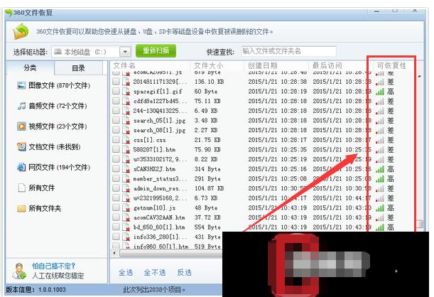4、掃描進行后360文件恢復作用會顯示遺失文件的狀況,大家見到可恢復性分成好多個等級,可以選擇自身要想恢復的文件試著開展恢復。此外也有一種是文件夾可恢復性為空缺的,此文件夾是可以恢復的,但是文件夾內部結構的文件很有可能已經被可讀寫,文件夾恢復后不一定能尋找需要的文件。