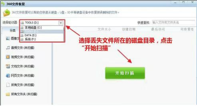 1、打開360文件恢復電腦版,選擇需要恢復文件所在的磁盤,接下來點擊“開始掃描”,等待磁盤掃描結束。