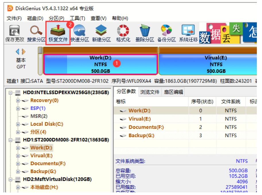 1、先打開DiskGenius軟件,選中我們需要恢復文件的硬盤分區,點擊“恢復文件”按鈕。