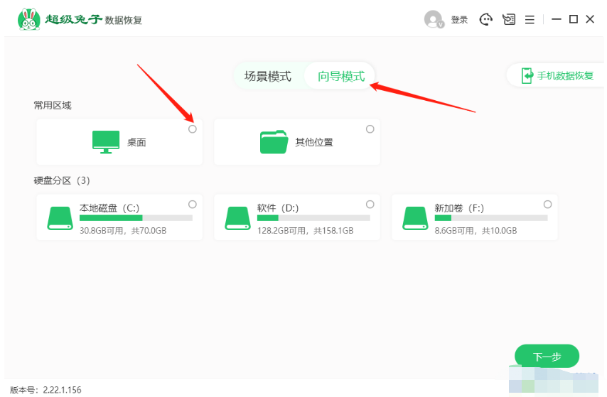 2、這里我們之間進入到【向導模式】中選擇自己需要恢復的區域或者分區,這里選擇【桌面】,然后點擊下一步。