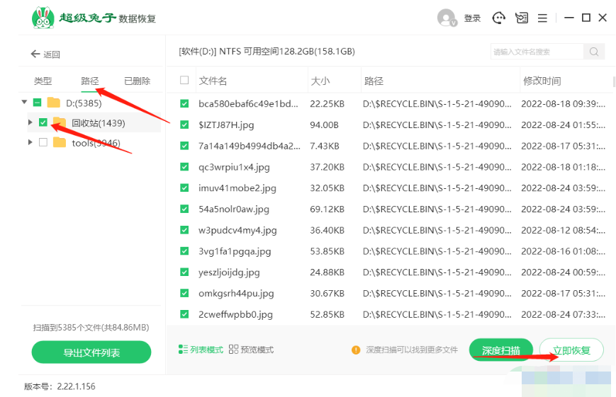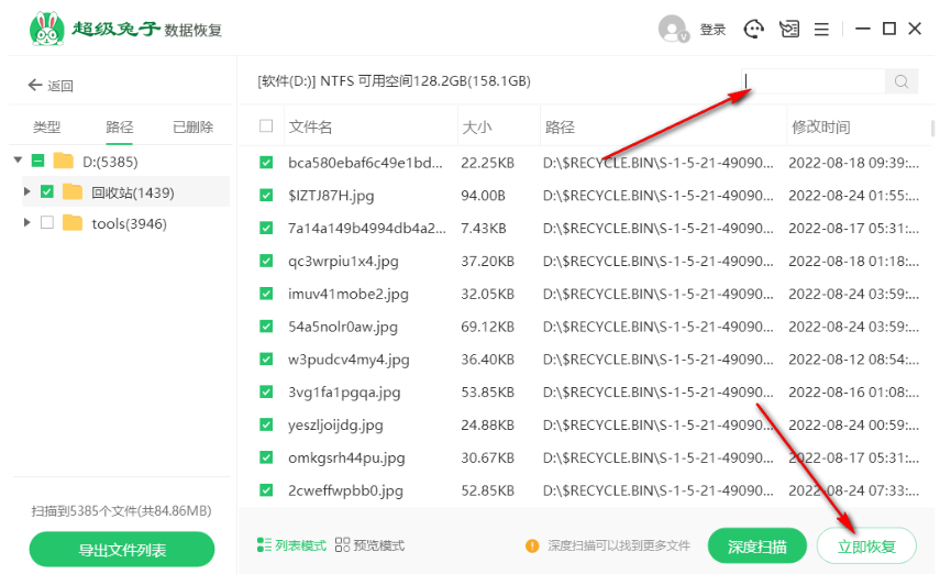 4、掃描完成后,把需要恢復的文件勾選上,再點擊右下角底部【立即恢復】按鈕,把數據另存為到其他的磁盤即可。