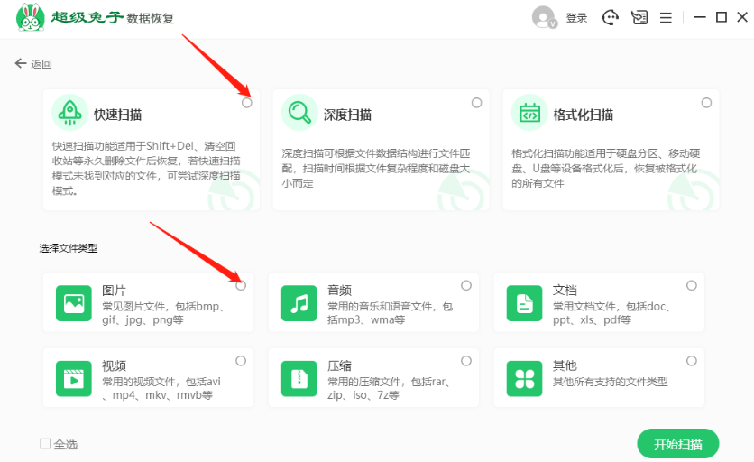 3、之后,在進入的頁面中,可以通過【快速掃描】【深度掃描】以及【格式化掃描】來選擇,如果我們選擇【快速掃描】則在下方需要選擇文件類型,根據自己想要恢復的文件來選擇,這里勾選【圖片】,然后點擊【開始掃描】。