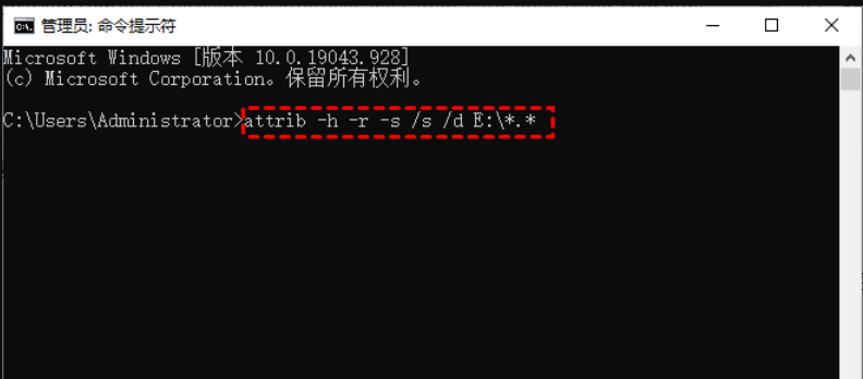 2、輸入以下命令:“ATTRIB -H -R -S /S /D X:*.*”,然后按回車鍵。這里的X是指包含已刪除數據分區的驅動器號。