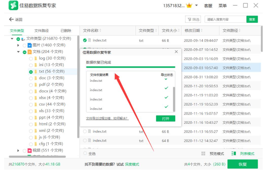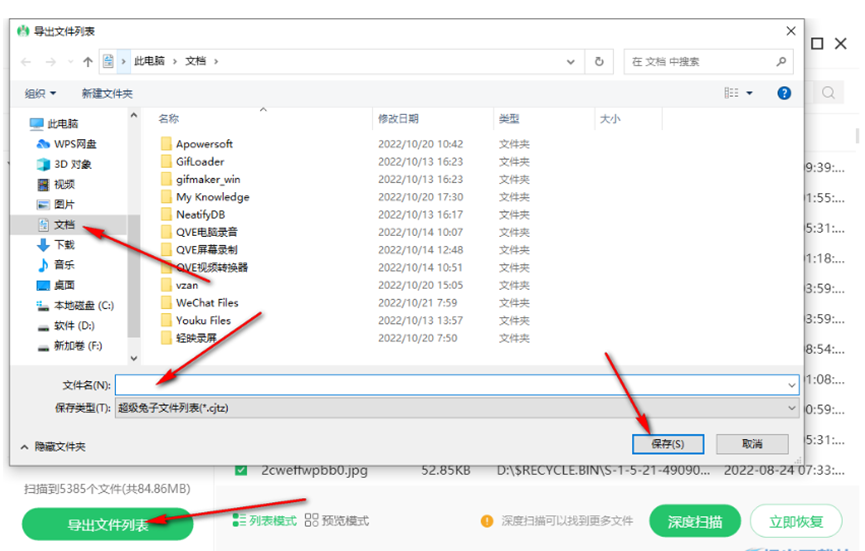 7、在左下角有一個【導出文件列表】按鈕,你可以點擊一下,將自己掃描勾選出來的文件導出在指定的文件夾中保存。