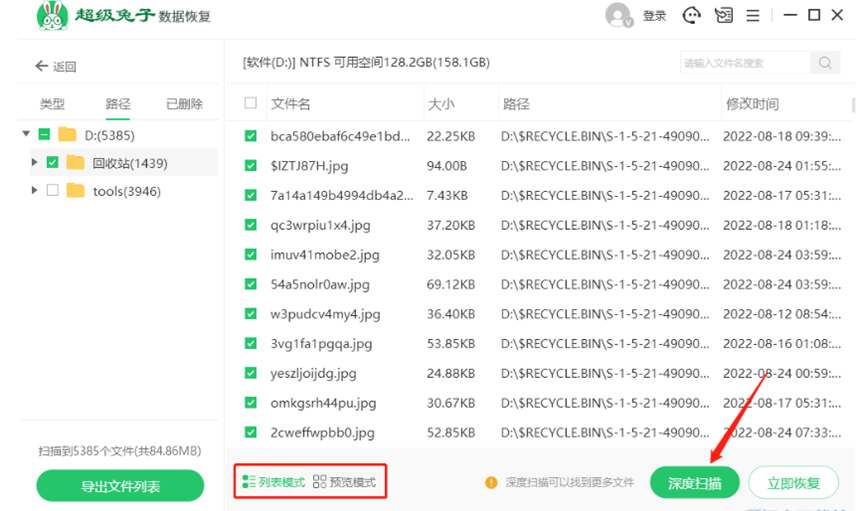 8、在頁面的底部你可以選擇將該頁面進行【列表模式】或者【預覽模式】來顯示,如果該頁面沒有掃描出自己需要恢復的文件,那么點擊【深度掃描】按鈕即可進入頁面再次掃描。