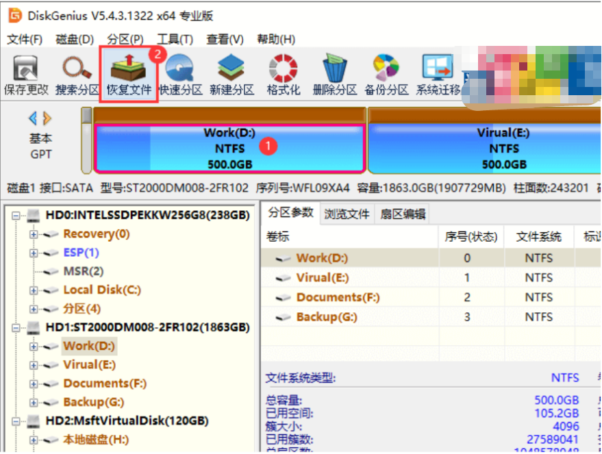 1、在電腦先打開DiskGenius軟件,選中我們需要恢復文件的硬盤分區,然后點擊“恢復文件”按鈕。