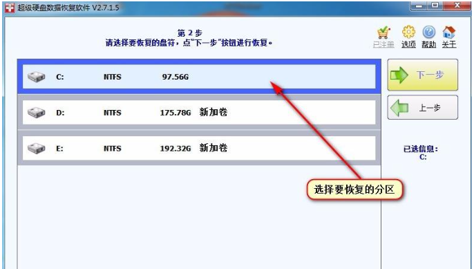 2、選擇需要恢復的磁盤盤符,點擊下一步。