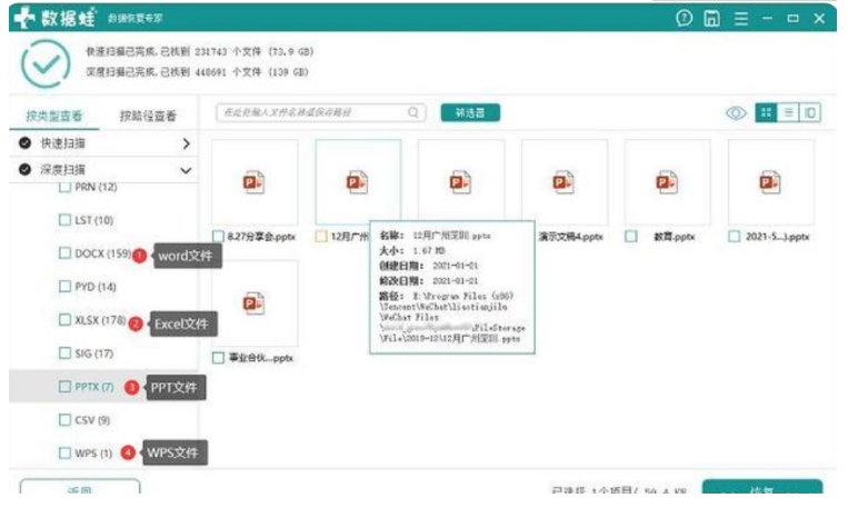 3、在掃描出來的結果中查找自己丟失的數據文件,同時可以通過視圖的切換來看一下文件的詳細信息,最后選擇好自己所有需要恢復的數據文件后點擊“恢復”!