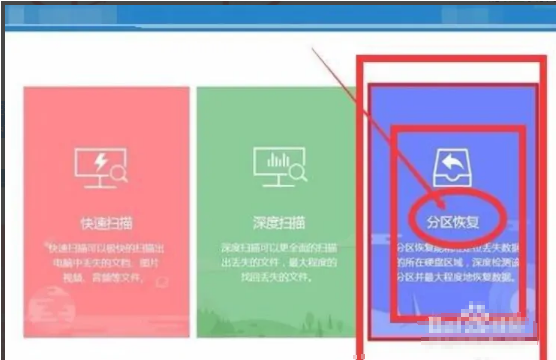 2. 進入軟件頁面將會看到三種選項:快速掃描、深度掃描、分區恢復選項,每個選項會有對應的工具具體描述,我們可根據實際情況選擇合適的進行操作,選擇分區恢復選項。