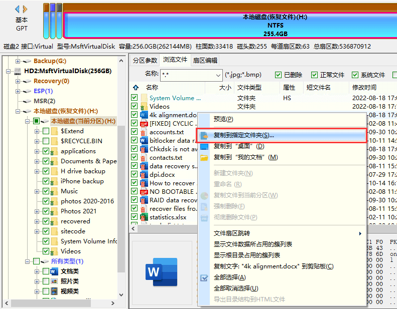 勾選想要恢復的文件,點擊鼠標右鍵并選擇“復制到指定文件夾”,之后就可以自己指定個位置來存放恢復的數據了。