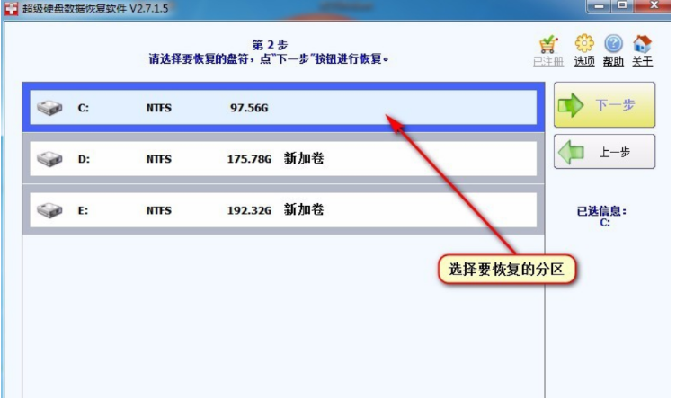 2.選擇需要恢復的硬盤盤符,點擊下一步;