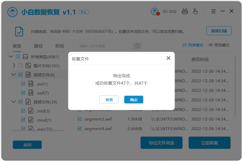 4、等待一會就能把選擇的全部文件恢復完畢了,點擊確定即可。