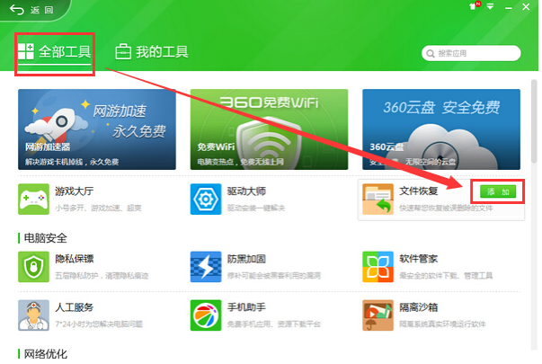 2、全部工具里我們找到360數據恢復大師(文件恢復),雙擊添加。