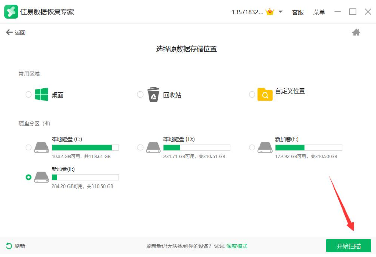 然后選擇數據原來的保存位置,選好后點擊“開始掃描”。