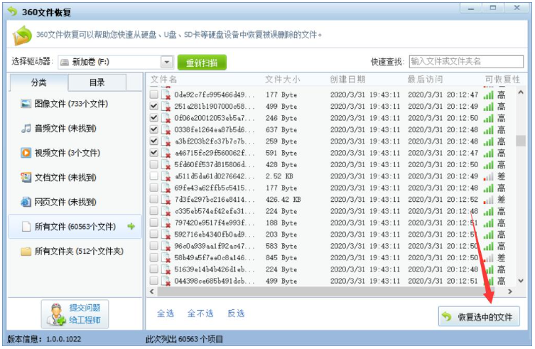 掃描完成后,選擇需要恢復的數據,點擊“恢復選中的文件”。