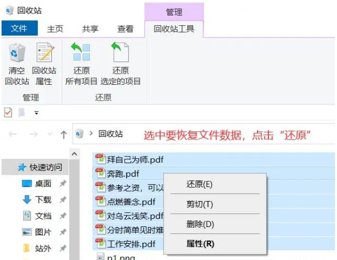 如果電腦數據刪除的時間并沒有很長,而且不是永久刪除,那么就可以在電腦回收站里面恢復數據。只需打開電腦回收站,在里面單個或多個選中要恢復的文件數據,接著右鍵單擊【還原】恢復到電腦里面即可。