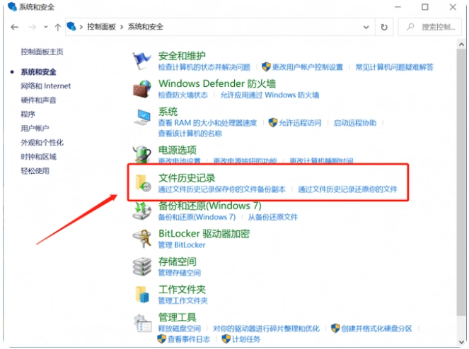 2、在控制面板中,找到并點擊“系統和安全-文件歷史記錄”進入。