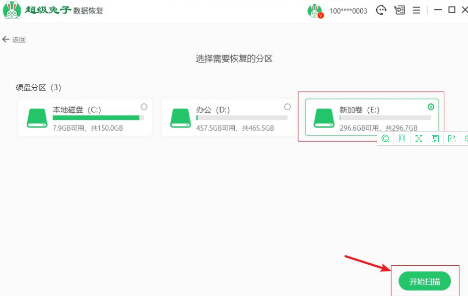 2、選擇我們需要恢復的分區,這里以E盤為例(具體可根據自己情況選擇位置),完成后點擊開始掃描。