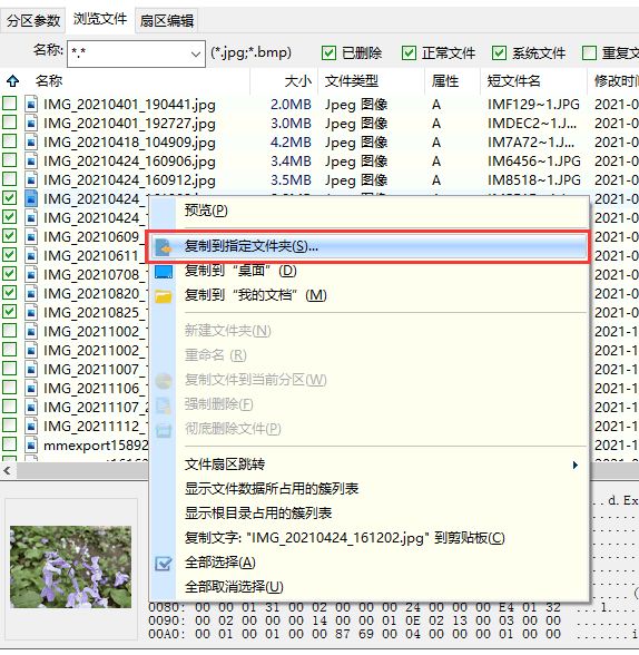 5、在軟件中勾我們選需要恢復的數據,點擊鼠標并選擇“復制到指定文件”選項。按照軟件提示,將文件保存好,數據恢復就完成了。