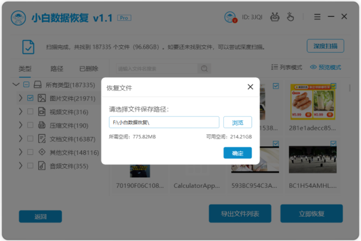 5、這里恢復的數據必須另存到其他盤中,避免前后數據被二次覆蓋破壞。如恢復的是c盤文件,則可以把恢復的數據恢復到D盤/F盤/E盤等。