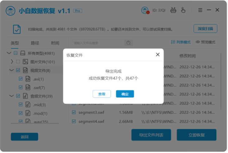 4、設置好需要保存的文件的位置,等待全部文件恢復完畢,點擊查看就可以去查看已經恢復的文件啦。