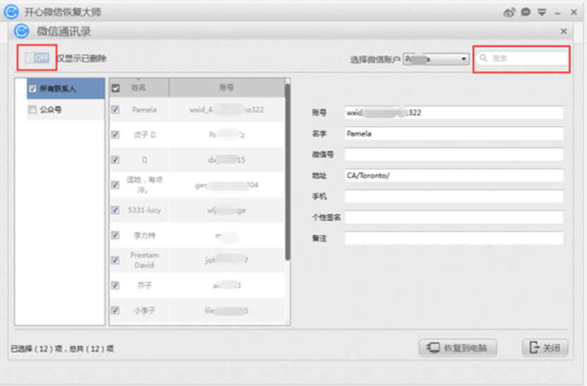 4、隨后點擊左上角的【 OFF 】,可僅查看已刪除微信聯系人,如聯系人過多,可在右上角搜索中填寫好友的名字等進行搜索。