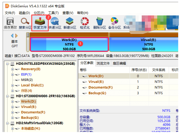 1、首先打開DiskGenius,選中丟失數據的分區,點擊"恢復文件"即可。