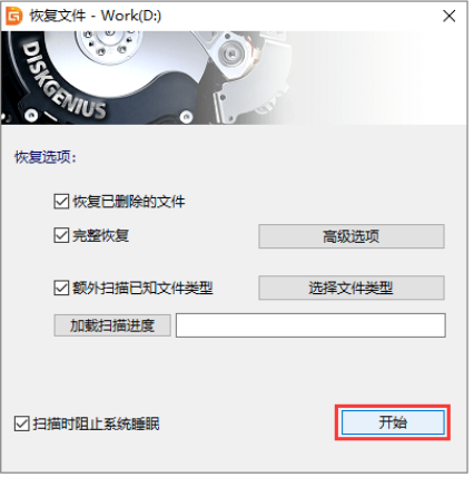 2、然后勾選所有的恢復選項,點擊"開始"按鈕,DiskGenius恢復數據工具將會開始搜索丟失的數據。