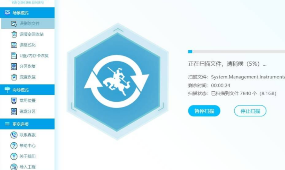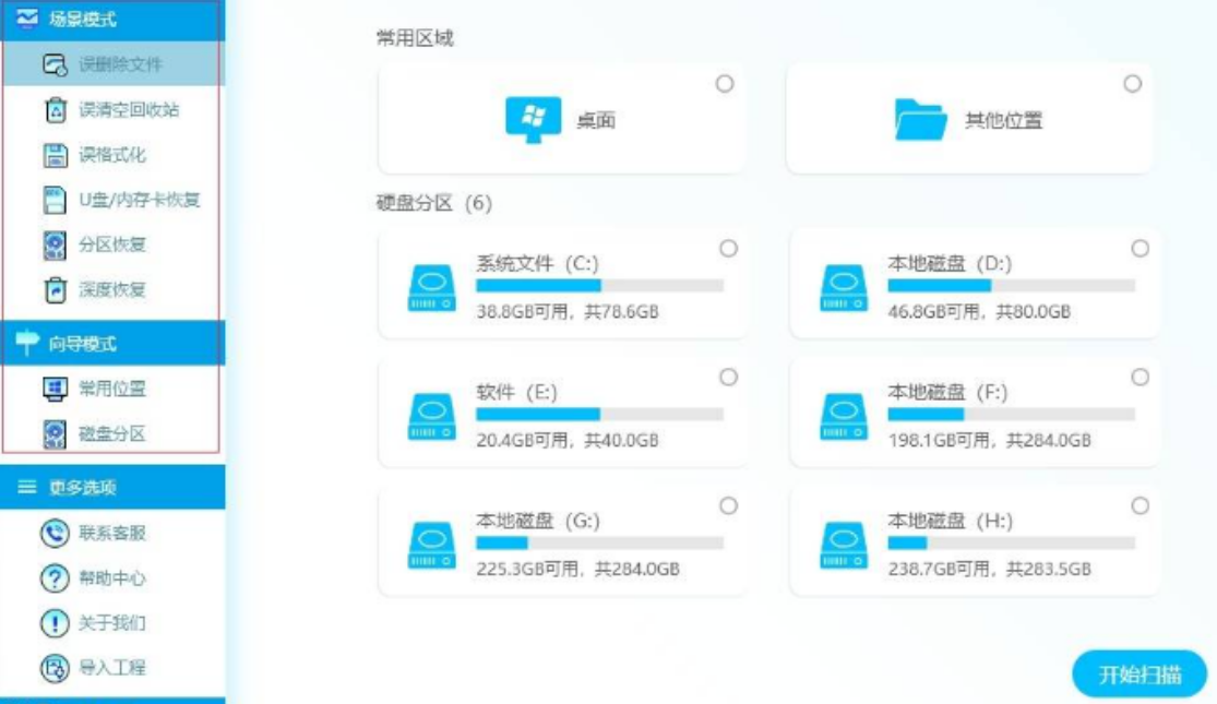 2、如果軟件安裝完畢,為盡早恢復數據,可以立即運行軟件,我們在打開的主界面左側選擇功能。這里以恢復誤刪文件為例,可選擇場景模式下的“誤刪除文件”。