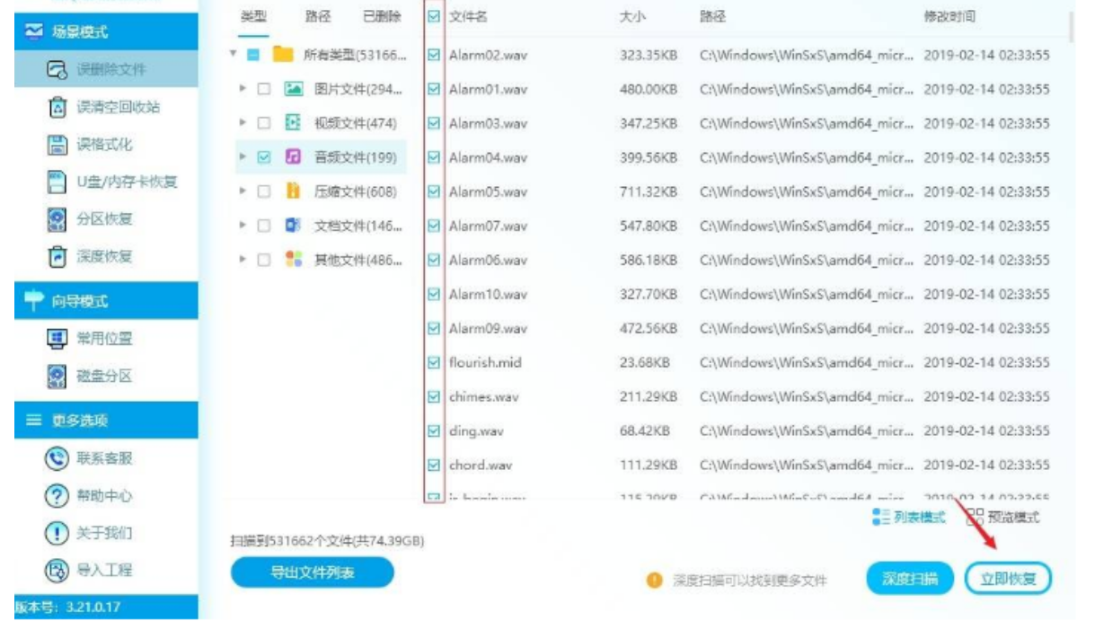 5、我們文件掃描完成后,可看到軟件界面右側有各種篩選方式,我們找到需要恢復的文件勾選后,然后單擊“立即恢復”。
