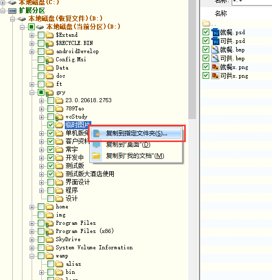 第四步:勾選需要恢復的文件/文件夾,右擊所選數據,然后選擇"復制帶指定文件夾"。之后就可以自己設置個位置來保存恢復的數據了。