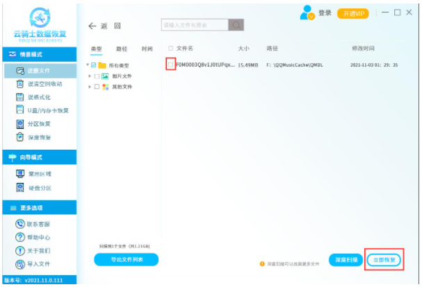 4、掃描完成后,把需要恢復的文件勾選上,再點擊右下角底部【立即恢復】按鈕,把數據另存為到其他的磁盤就可。