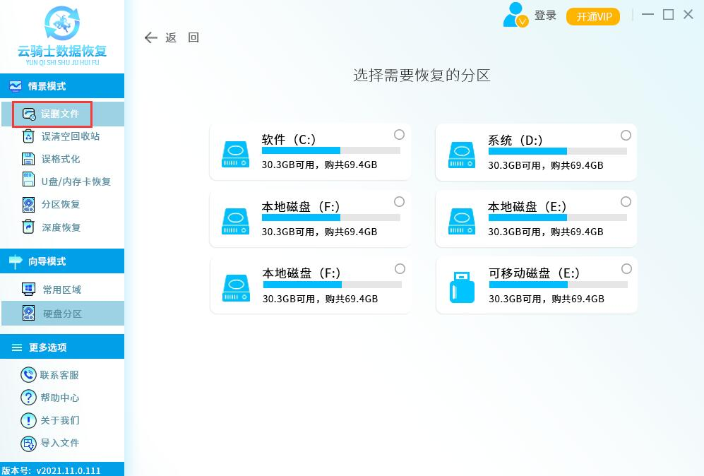 1、下載安裝云騎士數據恢復軟件,打開軟件操作頁面以后,根據數據丟失情況,選擇一個合適的模式進行恢復,這里選擇情景模式中的誤刪文件。