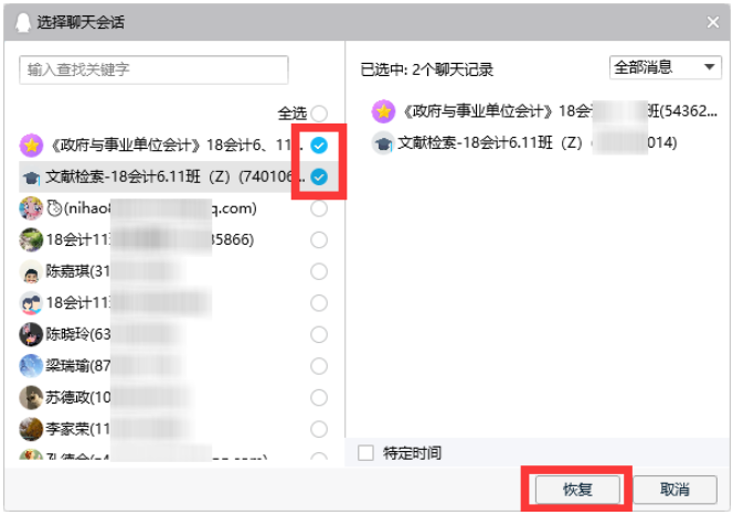 3、這時就會在【選擇聊天會話】中看到在電腦上的所有人的聊天記錄,勾選需要恢復的聊天記錄,點擊右下角的【恢復】即可。