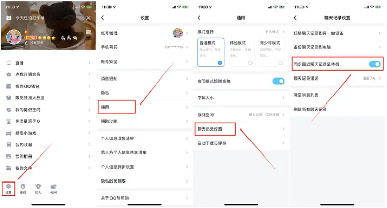 1、首先在手機上打開QQ,點擊頭像,在左下角依次點擊【設置】-【通用】-【聊天記錄設置】,確保【同步最近聊天記錄至手機】是打開狀態。