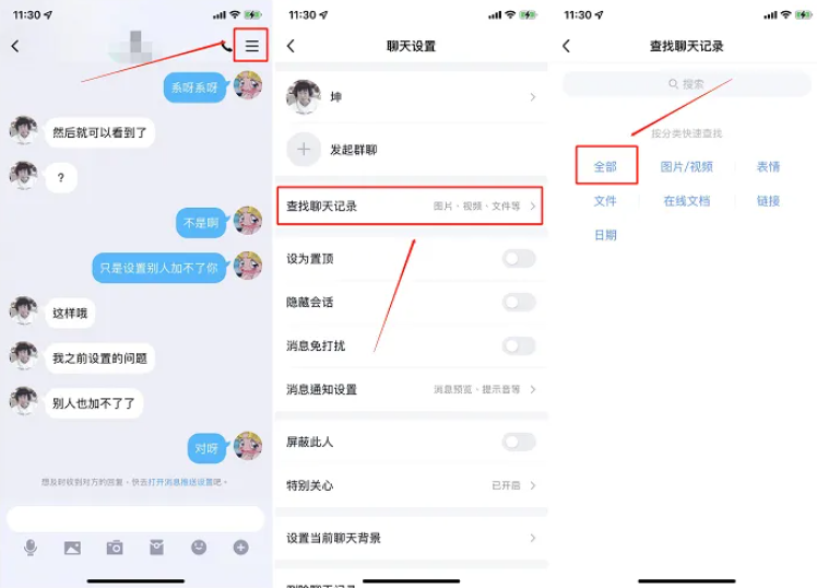 2、打開需要恢復聊天記錄的朋友的聊天框,點擊右上角的圖標(類似三條橫線),點擊【查找聊天記錄】,包括全部、圖片、視頻、表情、文件、在線文檔和日期等這幾種聊天內容分類,需要恢復哪種就點擊哪種。